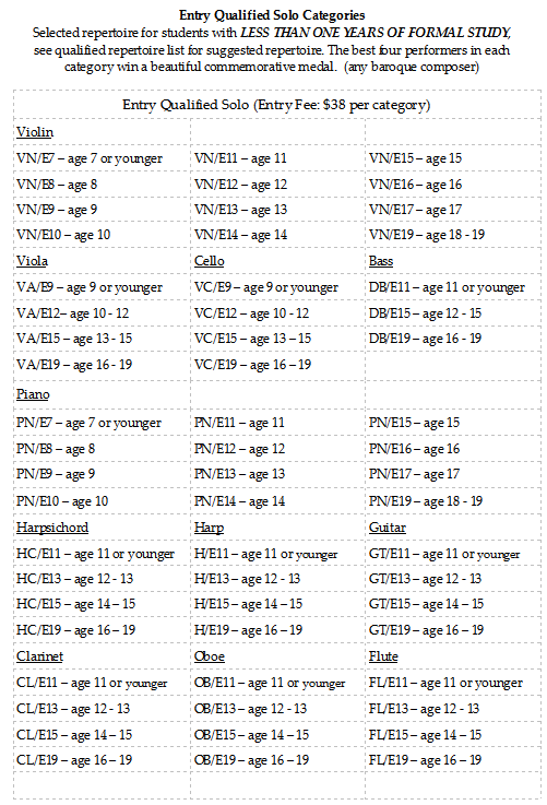 Selected repertoire for students with LESS THAN ONE YEARS OF FORMAL STUDY, See qualified repertoire list for suggested repertoire. The best four performers in each category win a beautiful commemorative medal. (Any baroque and early classical composer) For Clarinet any transcript music can be used. Please arrive 15 minutes prior to your scheduled performance. Make sure to register at the front desk and fill out the comment sheets with your contest info and repertoire for judges to use. You may sign up other two Qulified categories. Contestant who sign up these categories may not sign up with any of the Prodigy and Open categories.
