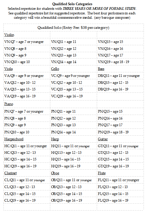 Selected repertoire for students with THREE YEARS OR MORE OF FORMAL STUDY. See qualified repertoire list for suggested repertoire. The best four performers in each category will win a beautiful commemorative medal. (any baroque and early classical period composers) For Clarinet any transcript music can be used. Please arrive 15 minutes prior to your scheduled performance. Make sure to register at the front desk and fill out the comment sheets with your contest info and repertoire for judges to use. You may sign up other two Qualified categories. Contestant who sign up these categories may not sign up with any of the Prodigy and Open categories. .